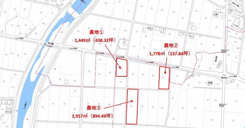 ■農地①:1,449㎡、45万円 農地②:2,957㎡、90万円 農地③:1,778㎡、50万円